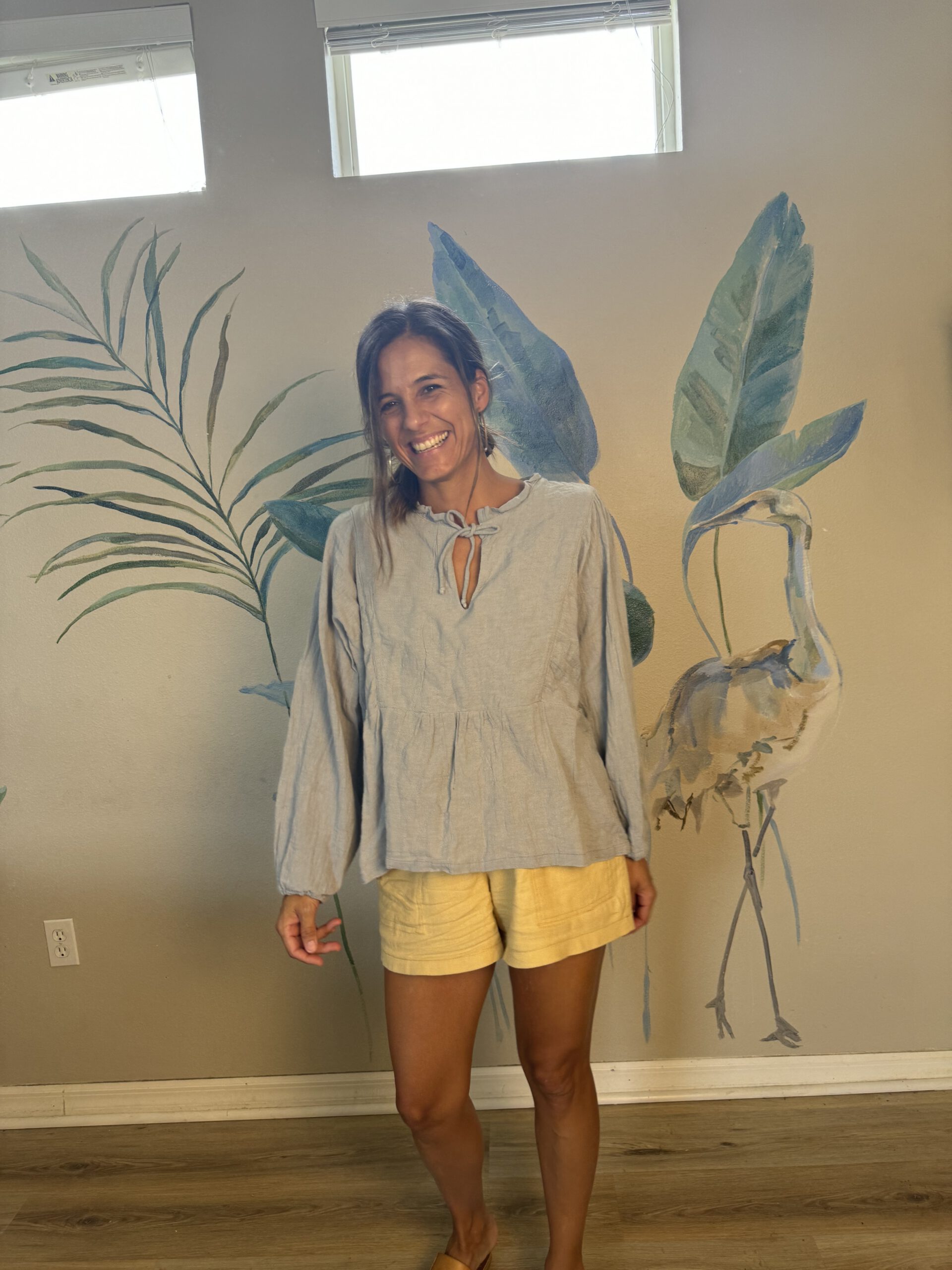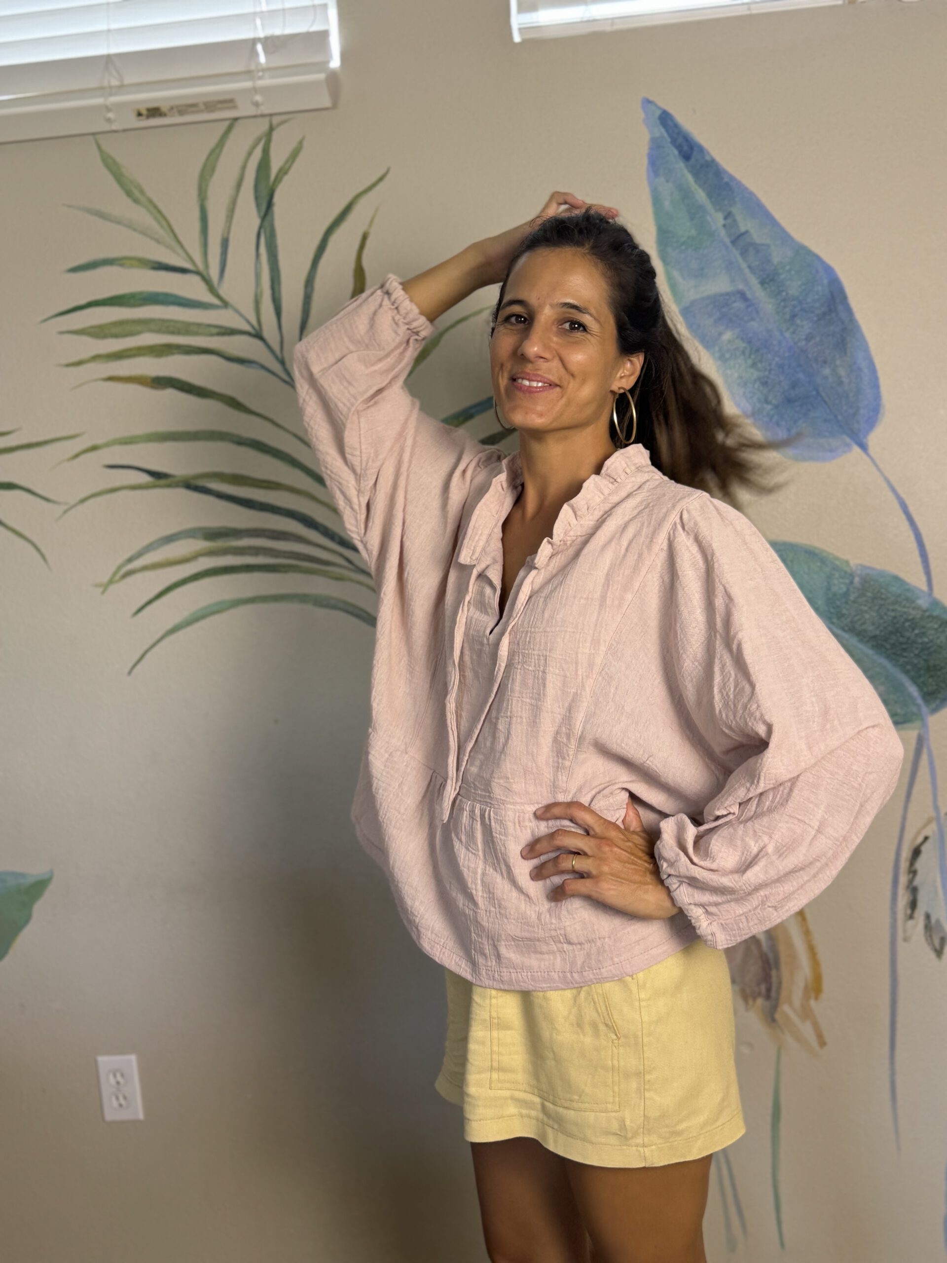 En un principio esta camisa era un vestido corto, me lo imaginaba en color claro con botas… Pero haciendo una muestra probe con un retazo de tela más corto, porque me interesaba más ver el trabajo que tiene en la pechera. Me la probé y me encantó como quedo corta como camisa… asique pasó a ser LA CAMISA DE GASA!
